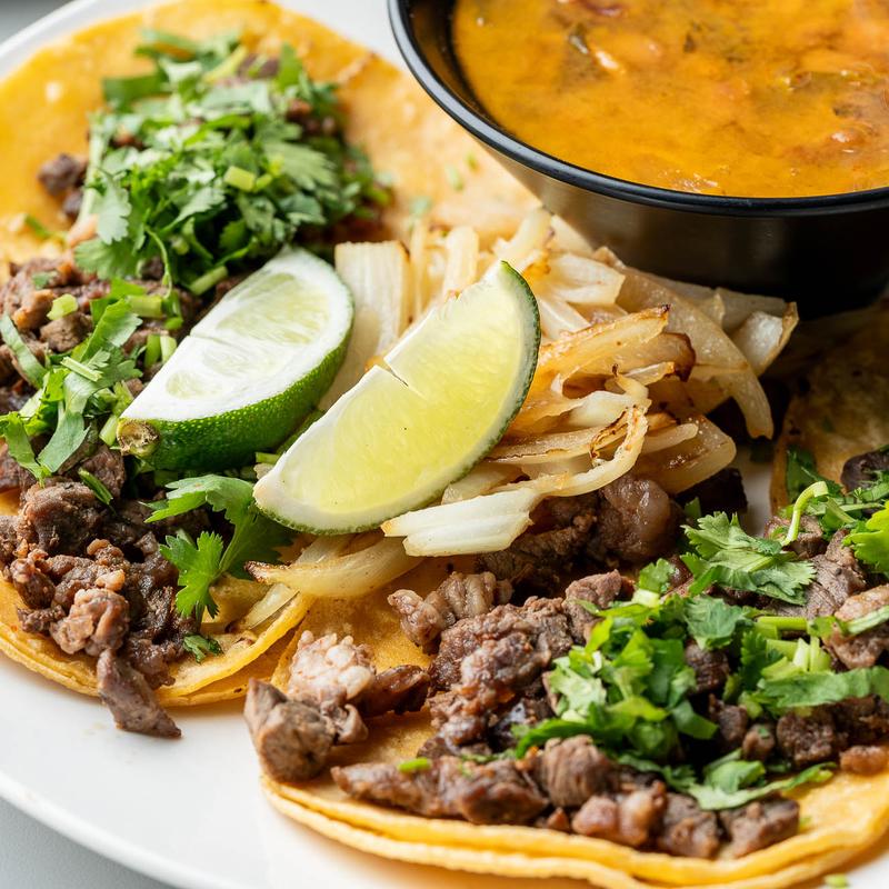 Small soft tacos in corn tortilla topped with your choice of meat (2) and cilantro. Served with grilled onions, grilled jalapeño & charro beans.